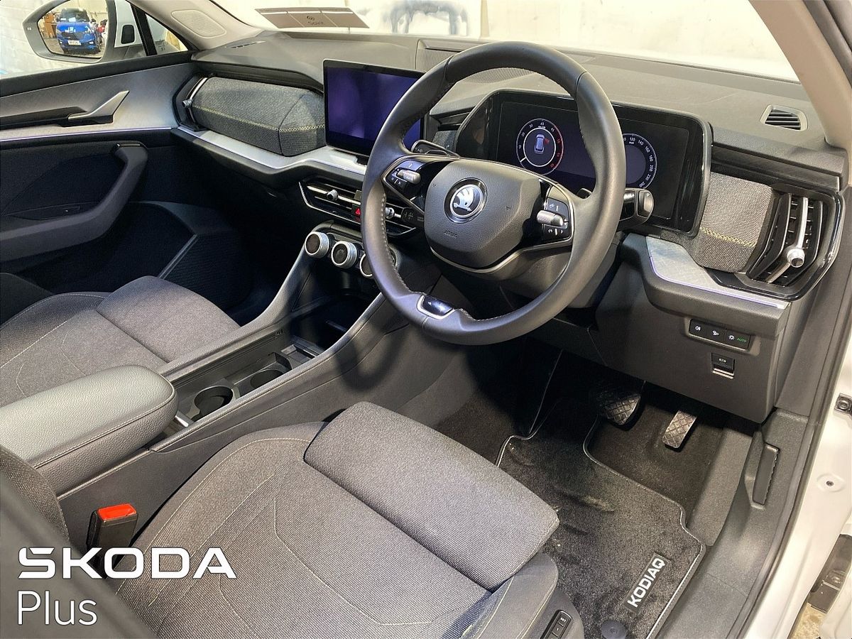 STUNNING 2025 KODIAQ SELECTION 2.0TDI 150BHP DSG FINISHED IN MOON WHITE METALLIC. STANDARD SPEC INCLUDES AN ELECTRIC DRIVERS SEAT WITH MEMORY FUNCTION, AN ELECTRIC TAILGATE, ADAPTIVE CRUISE CONTROL, HEATED FRONT SEATS, REVERSE CAMERA, PARK SENSORS, KEYLESS ENTRY, BLIND SPOTE DETECTION, TWO WIRELESS PHONE CHARGERS, POWER FOLDING MIRRORS, WIRELESS APPLE CARPLAY/ANDROID AUTO, LED AMBIENT LIGHTING AND MORE. CALL SALES TODAY ON 01 216 3666. LOW INTEREST RATE PCP AND HP FINANCE AVAILABLE