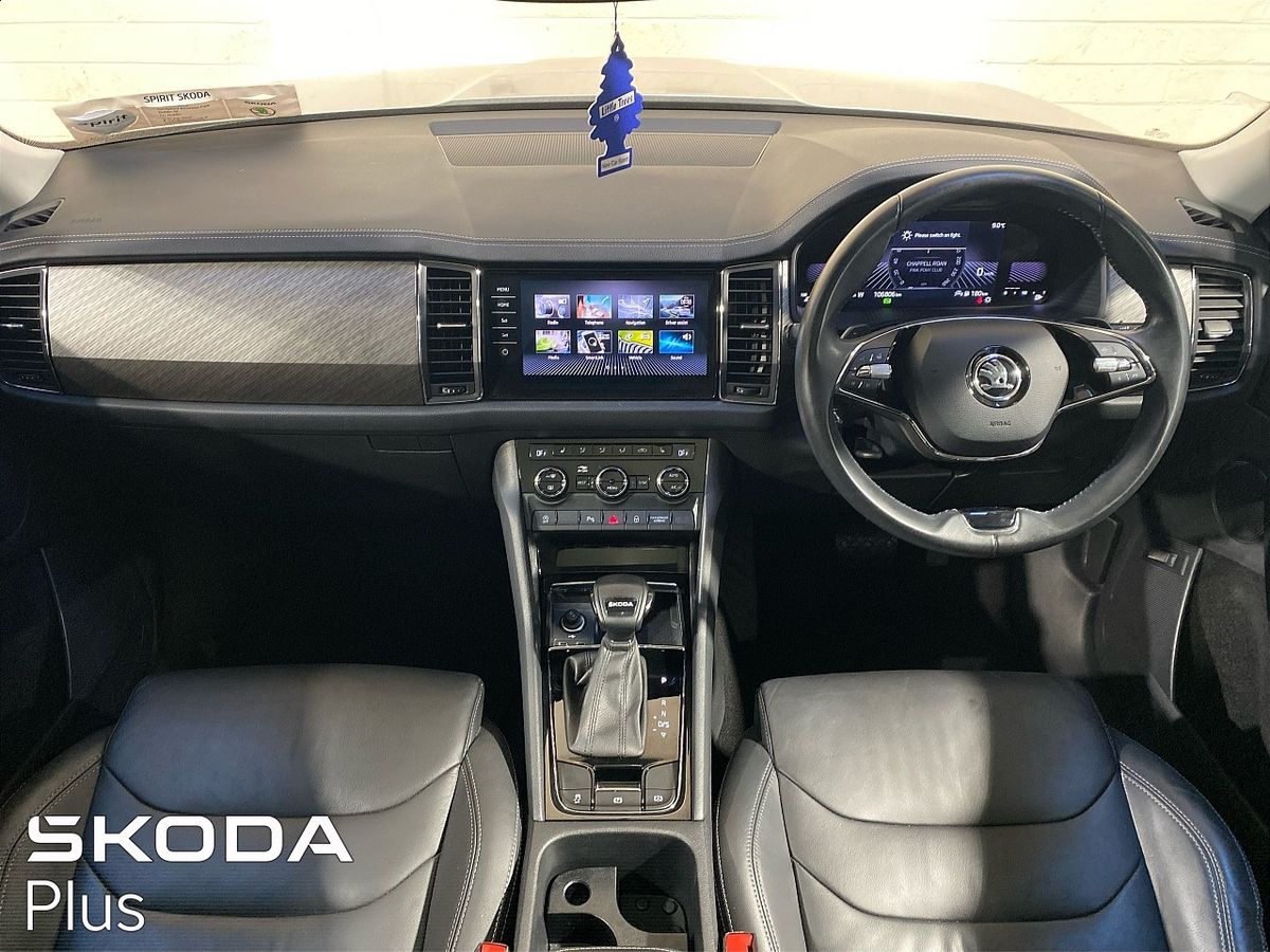 STUNNING 2023 KODIAQ STYLE 2.0TDI 150BHP DSG 7 SEATER FINISHED IN BRILLIANT SILVER METALLIC WITH BLACK LEATHER INTERIOR. THIS CAR WAS BOUGHT FROM US NEW AND COMES WITH A FULL SKODA SERVICE RECORD. WE HAVE JUST FULLY SERVICED THE CAR AND WILL PROVIDE THE NEW OWNER WITH 2 YEARS WARRANTY PLUS 2 YEARS ROADSIDE ASSISTANCE. EXTRAS FITTED ON THIS CAR INCLUDE A PANORAMIC SUNROOF, ELECTRIC TAILGATE, UPGRADED ALLOYS, REAR WINDOW SUNBLINDS AND MORE. STANDARD SPEC INCLUDES MATRIX LED HEADLAMPS, KEYLESS ENTRY, HEATED FRONT SEATS, WIRELESS PHONE CHARGING, SAT NAV, AMBIENT LIGHTING, ADAPTIVE CRUISE CONTROL, PRIVACY GLASS AND MORE. LOW INTEREST RATE FINANCE AVAILABLE. CALL LEE IN SALES TODAY ON 01 216 3666